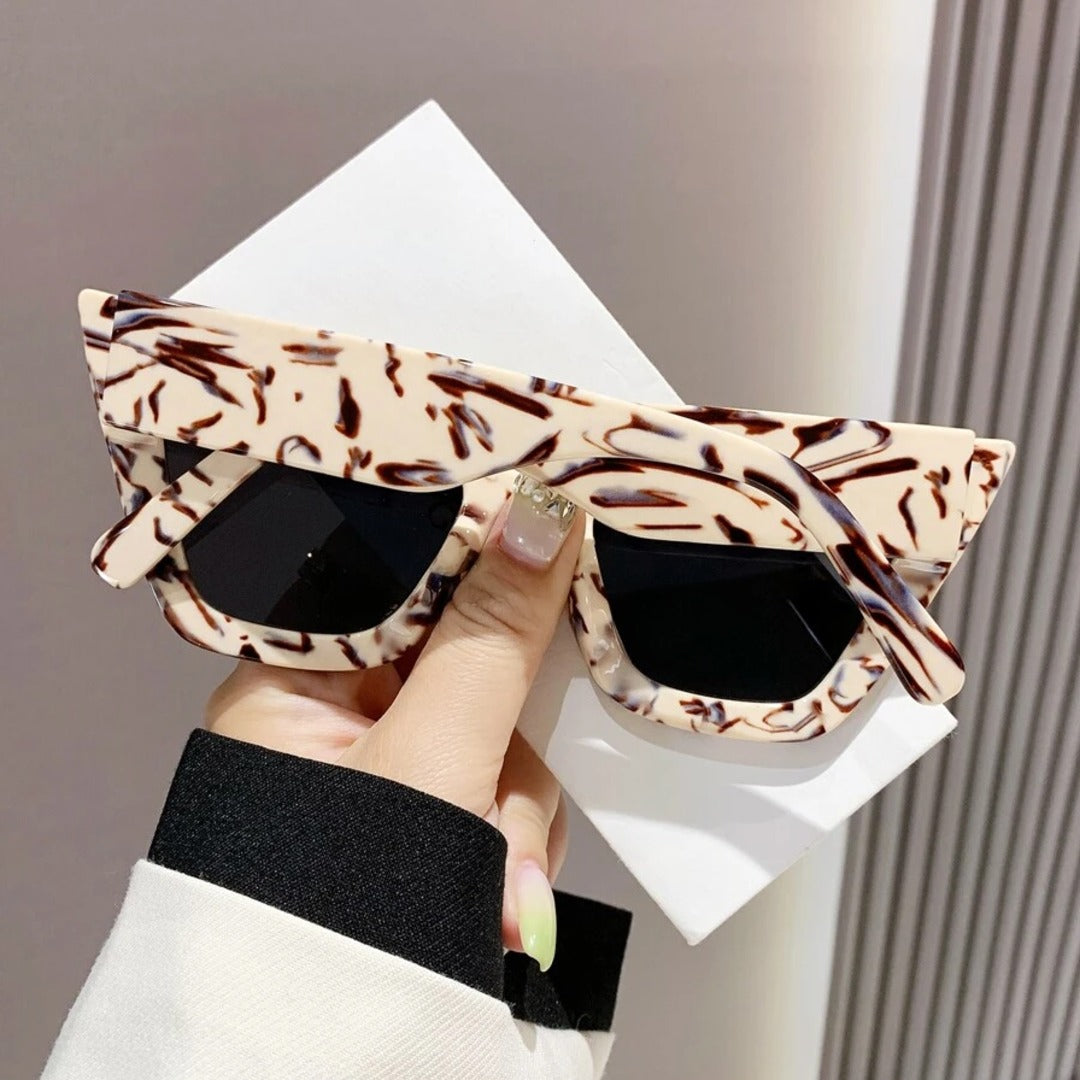 These tortoiseshell sunglasses feature a bold, oversized frame with a chic marble pattern. Perfect for adding a touch of retro glam to any outfit while keeping your eyes stylishly protected.
